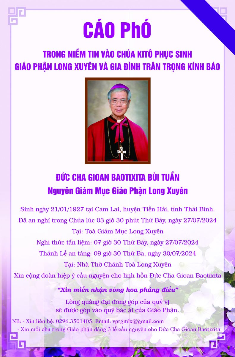 Trong niềm tin vào Chúa Kitô Phục Sinh, Giáo phận Long Xuyên và gia đình trân trọng kính báo Đức cha Gioan Baotixita Bùi Tuần, nguyên Giám mục Giáo phận Long Xuyên, sinh ngày 21.01.1927 đã an nghỉ trong Chúa lúc 03 giờ 30 phút thứ Bảy, ngày 27.07.2024.