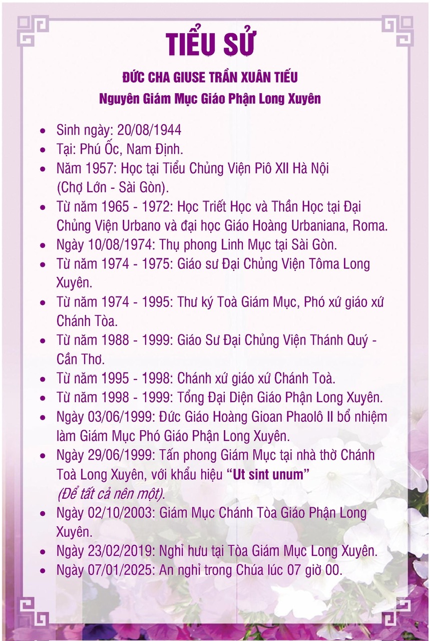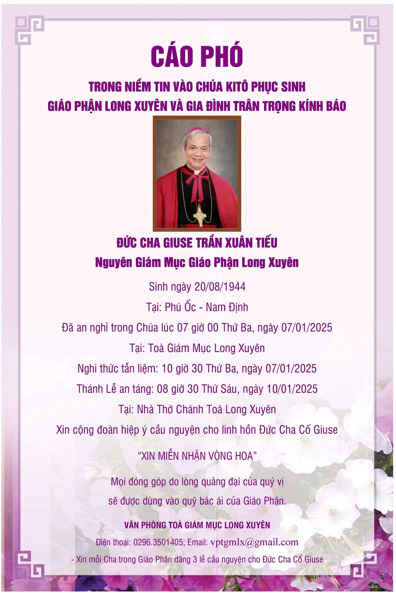 Trong niềm tin vào Chúa Kitô Phục Sinh, Giáo phận Long Xuyên và gia đình trân trọng kính báo: Đức Cha Giuse Trần Xuân Tiếu, nguyên Giám mục Chánh tòa Giáo phận Long Xuyên, đã an nghỉ trong Chúa lúc 07 giờ 00 thứ Ba, ngày 07/01/2025.