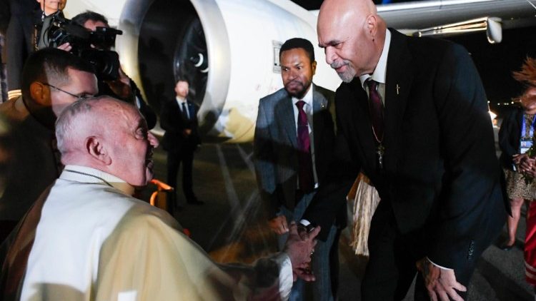 Vào lúc 7 giờ 6 phút chiều tối cùng ngày 6/9/2024 giờ Papua New Guinea, chiếc máy bay A330 của hãng hàng không Garuda của Indonesia chở Đức Thánh Cha và đoàn tùy tùng đã hạ cánh xuống sân bay quốc tế Jacksons ở thủ đô Port Moresby của Papua New Guinea, đánh dấu khởi đầu chặng thứ hai trong chuyến tông du thứ 45 của Đức Thánh Cha tại nước ngoài.