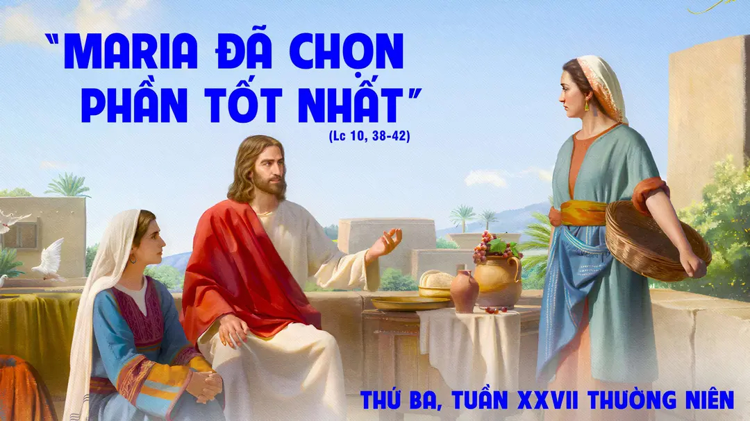 Nhưng Chúa đáp: "Martha, Martha, con lo lắng bối rối về nhiều chuyện (quá). Chỉ có một sự cần mà thôi, Maria đã chọn phần tốt nhất và sẽ không bị ai lấy mất".