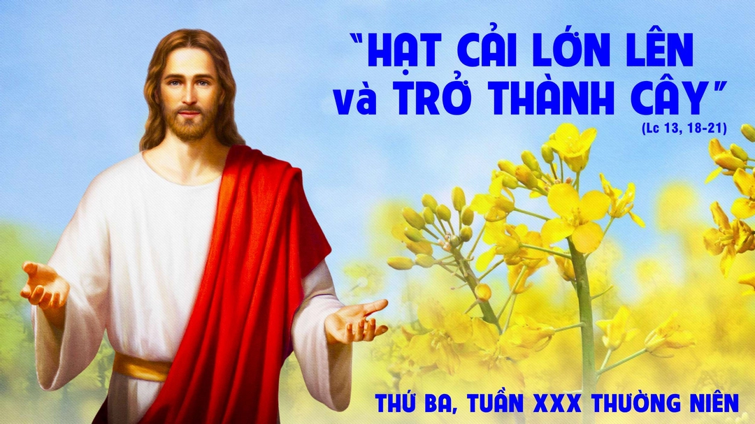 Khi ấy, Chúa Giêsu phán rằng: "Nước Thiên Chúa giống như cái gì? Và Ta sẽ so sánh nước đó với cái gì? Nước đó giống như hạt cải mà người kia lấy gieo trong vườn mình. Nó mọc lên và trở thành một cây to, và chim trời đến nương náu trên ngành nó".