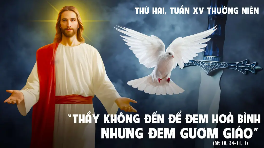 Khi ấy, Chúa Giêsu phán cùng các Tông đồ rằng: "Các con chớ tưởng rằng Thầy đến để mang hoà bình cho thế gian: Thầy không đến để đem hoà bình, nhưng đem gươm giáo. Vì chưng, Thầy đến để gây chia rẽ con trai với cha mình, con gái với mẹ mình, nàng dâu với mẹ chồng mình: và thù địch của người ta lại là chính người nhà mình. Kẻ nào yêu mến cha mẹ hơn Thầy, thì chẳng xứng đáng với Thầy. Kẻ nào yêu con trai con gái hơn Thầy, thì chẳng xứng đáng với Thầy.