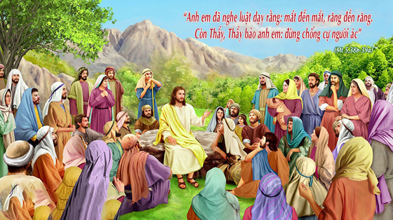 Còn Thầy, Thầy bảo các con: đừng chống cự lại với kẻ hung ác; trái lại, nếu ai vả má bên phải của con, thì hãy đưa má bên kia cho nó nữa. Và ai muốn kiện con để đoạt áo trong của con, thì hãy trao cho nó cả áo choàng nữa. Và ai bắt con đi một dặm, thì con hãy đi với nó hai dặm. Ai xin, thì con hãy cho. Ai muốn vay mượn, thì con đừng khước từ".