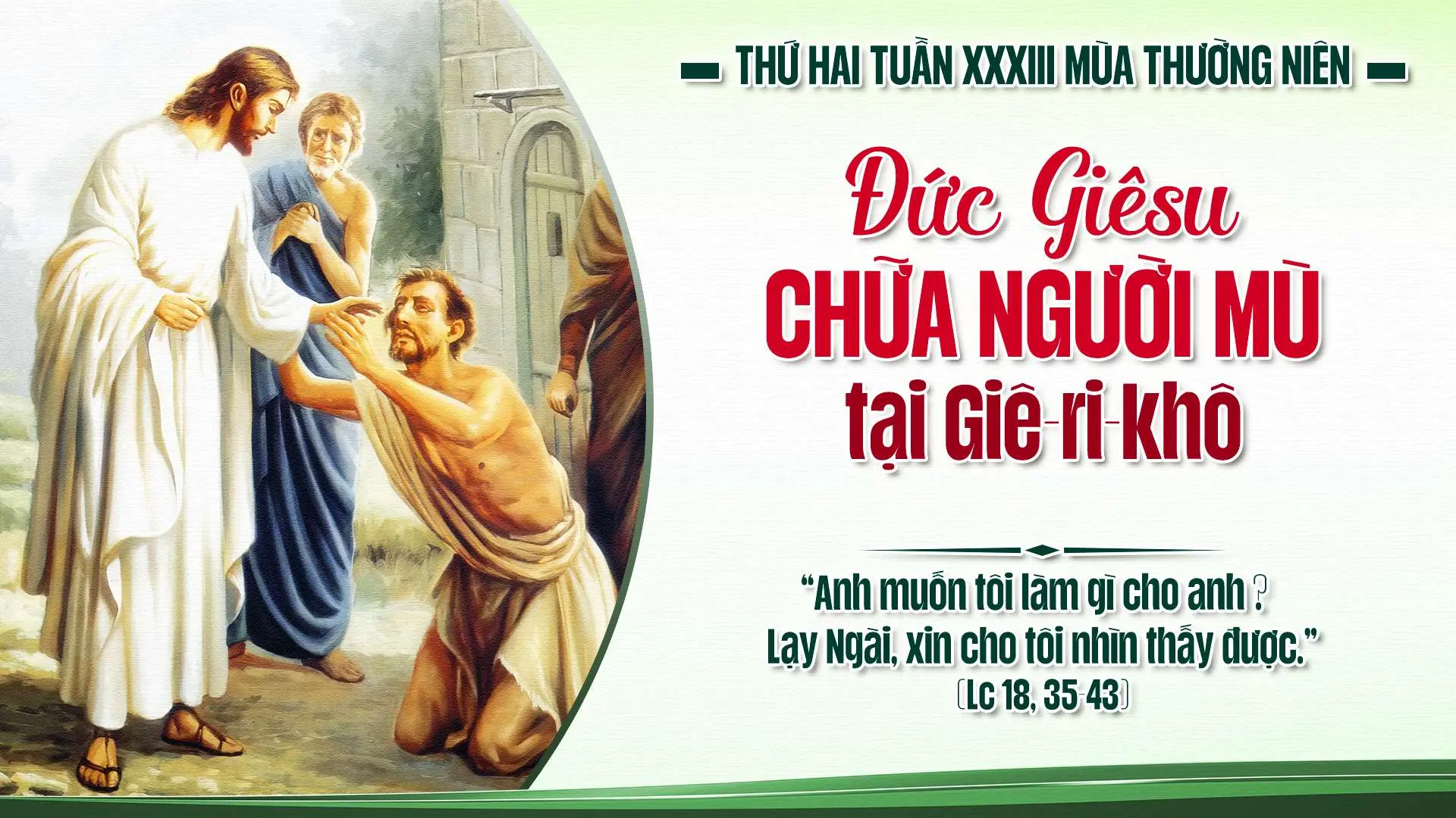 Bài Tin mừng hôm nay thuật lại việc Chúa Giêsu chữa lành cho người mù thành Giêricô. Anh ta ngồi bên vệ đường, nghe tin Chúa Giêsu đi qua liền kêu lớn tiếng: “Lạy Đức Giêsu, Con vua Đavít, xin dủ lòng thương tôi!” (Lc 18,38). Dù bị nhiều người quát nạt, anh vẫn không nản chí, càng kêu lớn hơn. Và Chúa Giêsu đã dừng lại, hỏi anh: “Anh muốn tôi làm gì cho anh?”. Anh thưa: “Lạy Thầy, xin cho con được thấy”. Ngay lập tức, anh được sáng mắt và đi theo Người, vừa đi vừa tôn vinh Thiên Chúa.