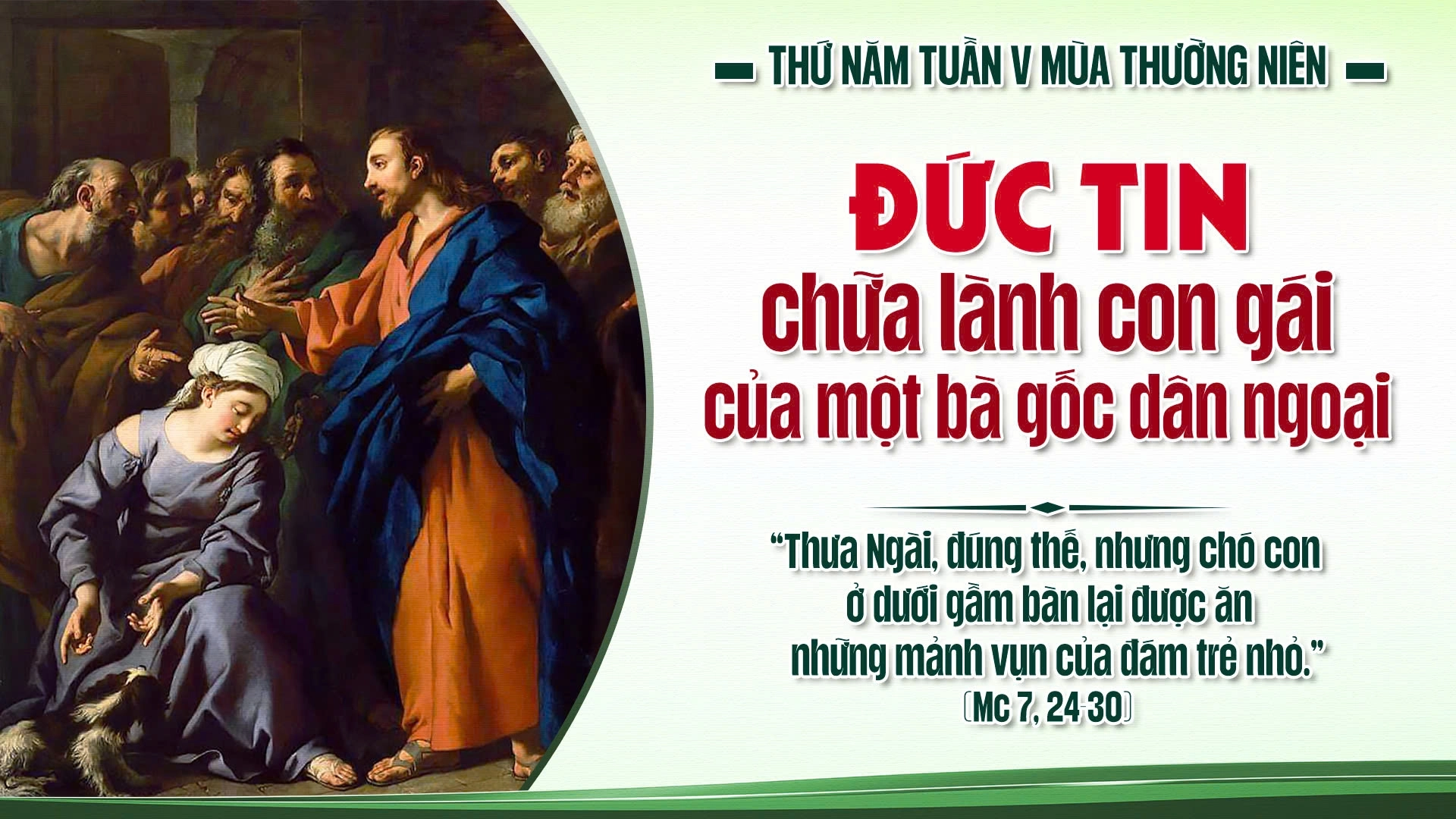 Trong bối cảnh thời Chúa Giêsu, một trong những nỗi khổ lớn nhất của con người là bị quỷ ám. Nỗi đau ấy trong Tin mừng hôm nay còn trở nên sâu sắc hơn, khi giáng xuống trên đứa con gái bé bỏng của một người mẹ ngoại giáo. Càng yêu con bao nhiêu, lòng bà càng bị giày vò bấy nhiêu. Chắc hẳn bà đã tìm đủ mọi cách để cứu chữa, nhưng tất cả đều vô vọng. Chỉ đến khi nghe biết Chúa Giêsu xuất hiện, trong lòng bà mới bừng lên niềm hy vọng, bởi bà tin rằng Người có thể cứu con mình.