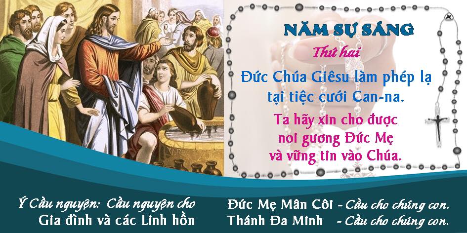 Tại tiệc cưới Cana, Chúa đã tỏ ra là Đấng Toàn Năng và Khôn Ngoan. “Đức Khôn Ngoan toả ra từ quyền năng Thiên Chúa và rực lên trong ngần từ vinh hiển Đấng Toàn Năng, nên không thể vương một tỳ ố” (Kn 7,25). Xin làm cho chúng con trở nên trong sạch, để ngày càng tin tưởng vững chắc hơn vào quyền năng của Ngài.