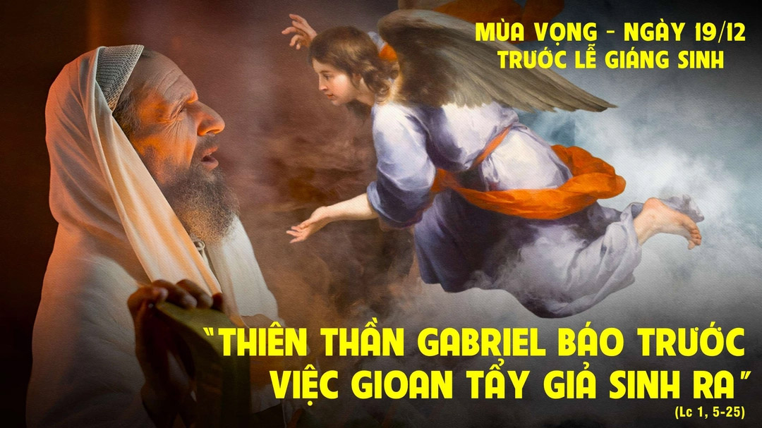 Giacaria thưa với Thiên Thần rằng: "Làm sao tôi biết được, vì tôi đây đã già, và vợ tôi cũng đã cao niên?" Thiên Thần liền đáp: "Ta là Gabriel, ta đứng chầu trước mặt Thiên Chúa, ta được sai đến nói với ngươi, và báo cho ngươi tin lành nầy. Thì đây, ngươi sẽ nín câm và không nói được, cho đến ngày các điều ấy xảy ra; bởi vì ngươi đã không tin lời ta, là những lời sẽ nên trọng khi đến thời của chúng".