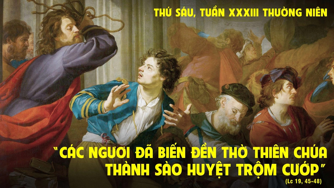 Khi ấy, Chúa Giêsu vào đền thờ, Người liền xua đuổi các người buôn bán tại đó và phán bảo họ rằng: "Có lời chép rằng: Nhà Ta là nhà cầu nguyện, các ngươi đã biến thành sào huyệt trộm cướp". Và hằng ngày Người giảng dạy trong Ðền thờ. Các thượng tế, luật sĩ và kỳ lão trong dân tìm cách hại Người, nhưng họ không biết phải làm cách nào, vì dân chúng hết thảy đều chăm chú nghe Người.
