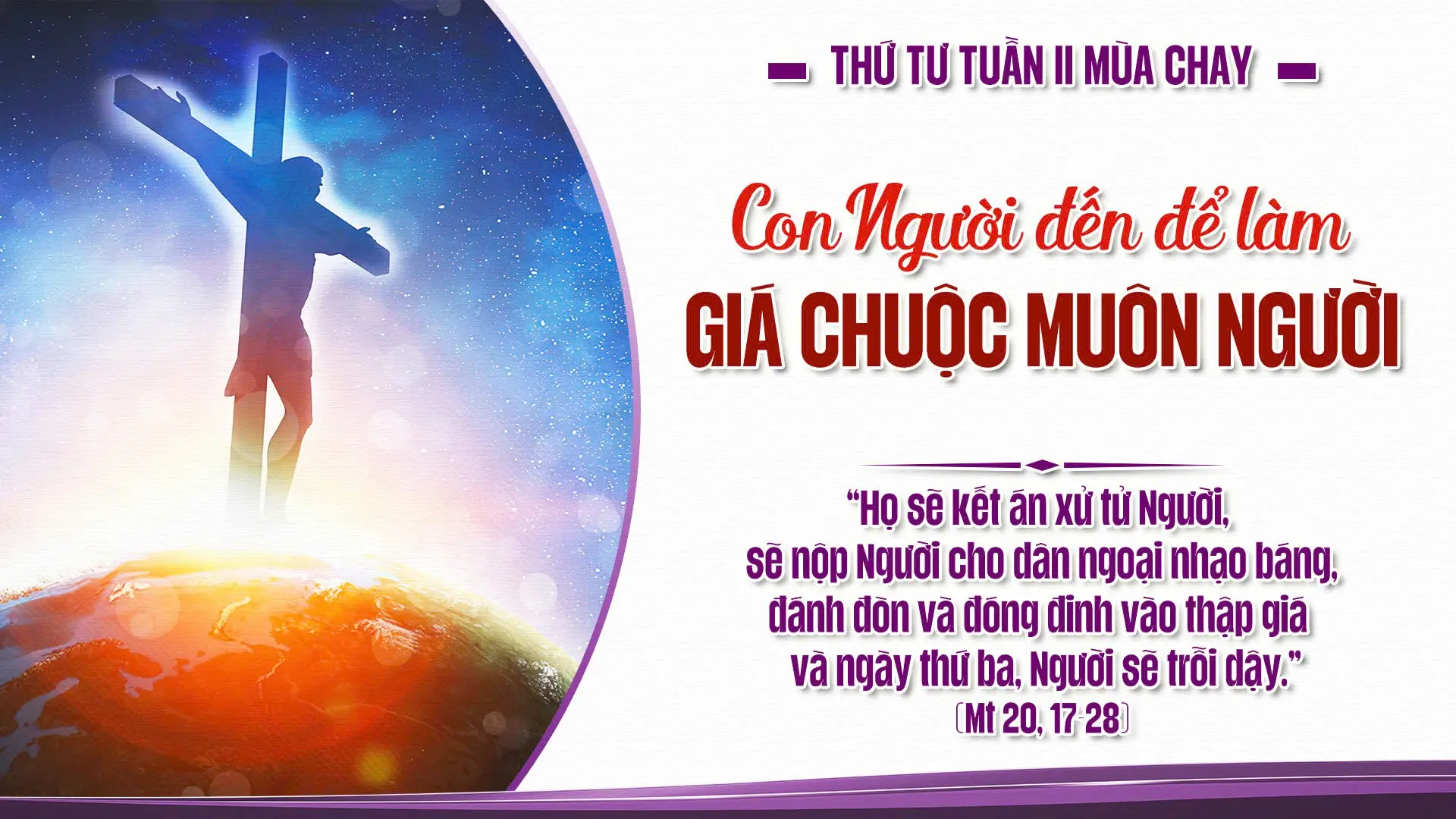 Khi ấy, Chúa Giêsu đi lên Giêrusalem, đem riêng mười hai môn đệ đi theo. Dọc đường, Người nói với họ: “Này chúng ta lên Giêrusalem và Con Người sẽ bị nộp cho các vị thượng tế và luật sĩ. Người ta sẽ lên án tử cho Người, sẽ nộp Người cho dân ngoại để chúng nhạo báng, đánh đòn, rồi treo Người lên thập giá, nhưng đến ngày thứ ba, Người sẽ sống lại”.