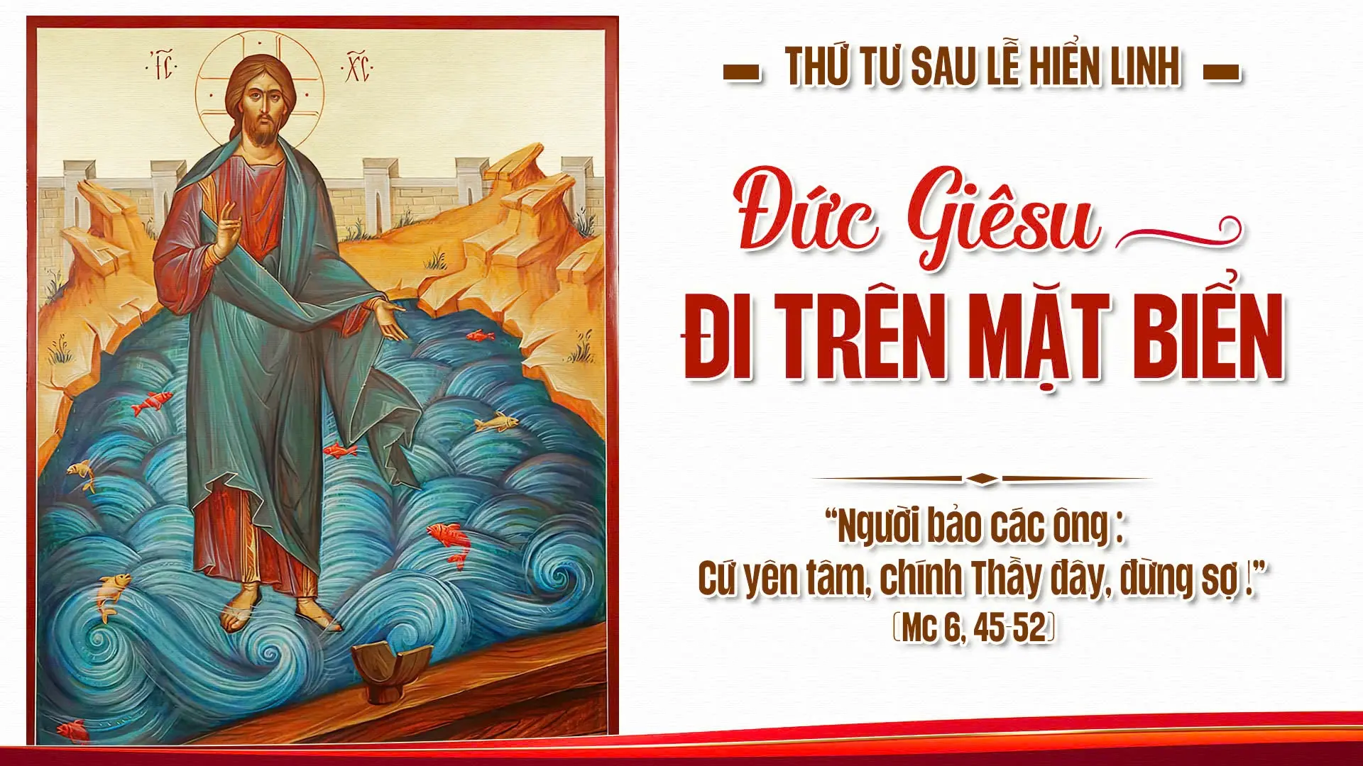Khoảng canh tư đêm tối, Người thấy họ khó nhọc chèo chống vì ngược gió, Người đi trên mặt biển mà đến với họ, và Người muốn vượt qua trước họ. Họ thấy Người đi trên mặt biển, thì tưởng là ma, nên la hoảng lên. Vì ai nấy đều thấy Người và hoảng hốt, nên Người liền lên tiếng bảo họ rằng: "Hãy yên trí, chính Thầy đây, đừng sợ". Rồi Người lên thuyền họ, và gió im lặng. Tâm hồn họ lại càng sửng sốt hơn, vì họ chưa hiểu gì về vấn đề bánh: lòng họ còn mù tối.